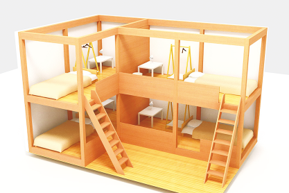 1部屋を4~8人でシェアする相部屋タイプ。主に二段ベッドを利用。室内にセキュリティーボックスを完備。